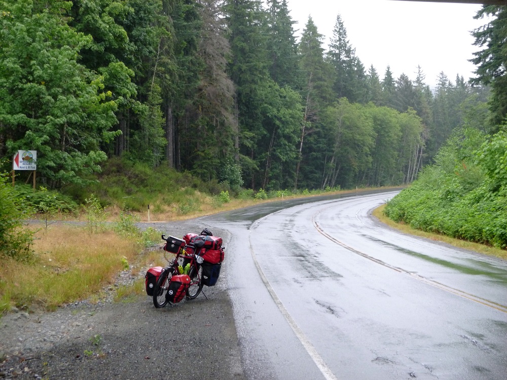 Weiter durch den Regen ohne nennenswerte Vorkommnisse, über viele Hügel immer durch den Wald, während viele Holzfällertrucks an einem vorbeiziehen. Neben Bergbau spielt die Forstwirtschaft in der Kanadischen Wirtschaft eine große Rolle und entsprechend zahlreich sind die Holzfällertrucks unterwegs. Am nächsten Tag dann etwas besseres Wetter, aber am Ende werde ich doch noch nass, bevor ich mich zu einem Cheesburger in einen Pub retten kann. Immerhin finde ich einen schönen Wildzeltplatz in Telegraph Cove direkt über der Bucht mit schöner Aussicht über die vorgelagerten Inseln und die riesigen Kreuzfahrtschiffe, die sich gelegentlich zwischen ihnen hindurchschieben. Wie Wild der Zeltplatz war, habe ich erst gemerkt, als ich zufällig in den Schwarzbären gelaufen bin, dessen Kothaufen ich zwar überall gesehen hatte, ich wusste also, dass er irgendwo in der Nähe sein musste, war aber doch überrascht, dass er nur 10 Meter neben dem Weg auf einem Stein saß und nur 50 m von meinem Zeltplatz entfernt. Blöderweise hatte ich meine Kamera nicht dabei und so lief ich schnell zurück zu meinem Fahrrad, um sie zu holen. Da hatte sich der Bär aber auch schon entschieden in die Büsche zu verschwinden, und so konnte ich kein schönes Bild schießen. Pech. Immerhin hat er mich in der Nacht in Ruhe gelassen. Mit den Taschen voller Essen kann es natürlich schon mal vorkommen, dass man nächtlichen Bärenbesuch bekommt, aber das wohl erst in einer anderen Nacht. So genieße ich fürs Erste die Natur, am Morgen aufzuwachen und in die großen dunklen Augen eines Rehkitzes zu schauen, das mit seiner Mutter direkt neben meinem Zelt nach Futter sucht, die zahlreichen Weißkopfseeadler, die Bären (ohne bisher ein gutes Bild bekommen zu haben) und die Orcas, die den unglücklichen Namen Killerwale nicht mehr los werden. Mit dem Tourboot muss ic