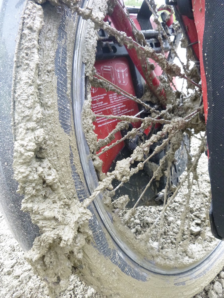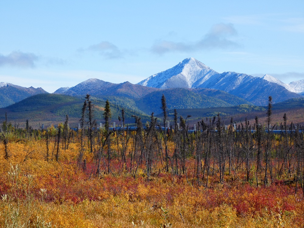 Die Straße war dabei immer nass, während ich das Glück hatte trocken zu bleiben. Was auf Asphalt kein Problem ist, verwandelt die Erdpiste, die der Dalton ist, in eine Straße mit Schlammauflage. Binnen kürzester Zeit sind Fahrer, Fahrrad und Gepäck komplett eingesaut. Die Kette mit einer dicken Schlammschicht überzogen und der Matsch, der sich unter dem Schutzblech zusammenschiebt macht das Fahren doppelt anstrengend, aber das Fahrrad läuft und läuft – gemacht für solch harte Bedingungen und darüber bin ich froh. Abgekämpft finde ich am Abend einen trockenen Zeltplatz, als die Wolken sich langsam verziehen und noch für die letzten 30 Minuten die Sonne herauskommt, die die Pipeline über meinem Zelt golden leuchten lässt. Das ist er also der Dalton Highway. Ruhig und friedlich liegt er da, während sich das Licht der untergegangenen Abendsonne golden rötlich in der feuchten Piste spiegelt. Schon vergessen ist die Schlammschlacht des Tages und ein angenehmes Gefühl der Ruhe breitet sich in mir aus. Man hat das Gefühl ganz weit draußen, fern ab von allem zu sein. Und das ist schön. So friedlich und still. Ich habe mir schon fast gedacht, dass ich unter der Pipeline theoretisch nicht campen darf, es war aber der einzige nicht schlammige Ort und so kommt am nächsten Morgen tatsächlich ein Security Mann angefahren, der mir freundlich erklärt, dass ich mich hier nur mit schriftlicher Genehmigung aufhalten dürfe. Er fragt wo ich herkomme und wo ich hinwolle, ist ganz beeindruckt von der bisher erbrachten Leistung und kurzerhand stellt er mir eine schriftliche, offizielle Genehmigung aus, dass ich mich an der Pipeline aufhalten und mich entlang des parallel verlaufenden Wartungsweges bewegen darf. Ein kurzes Foto, ein Händedruck und ich darf in Ruhe mein Frühstück beenden, bevor ich mich wieder auf den Weg mache. Die Reise setze ich dann aber doch entlang der Hauptstrecke fort, die über Nacht deutlich abgetrocknet und nun passabel zu fahren ist, bis sie sich im laufe des Tages, an dem immer wieder die Sonne herauskommt, vollständig zu einer trockenen, harten Lehmpiste wandelt. Auf diesem Belag rollt es sich nun fast wie auf Asphalt und ich komme bestens vorwärts. Am Abend suche ich wieder die Pipeline auf. Heute mit der Option in der Nacht wahlweise vom Bären oder vom Wolf gefressen zu werden. Die Tiere nutzen den Wartungsweg aus Bequemlichkeit und die Spuren der Beiden gehen direkt neben meinem Zelt vorbei. Meine Essenstasche verstaue ich sicherheitshalber diese Nacht weit weg vom Zelt auf einem Querträger der Pipeline in 3 Meter Höhe. Feucht kalt ist der nächste Morgen. Mit eisigen Fingern fahre ich dem Polarkreis im Nieselregen entgegen. Das macht keinen Spaß und man sieht nichts von der Landschaft und so beschließe ich nach einem Glas Sekt am Polarkreis (das darf ruhig gefeiert werden!) an dieser Stelle nach nur 48 km Feierabend zu machen. Die richtige Entscheidung, wie sich am nächsten Tag zeigen sollte. Bei null Grad starte ich in den sonnigen Morgen, die vielen Hügel wärmen einen schnell auf und die Landschaft wird mit jeder Kurbelumdrehung toller. In ein Tal mit leuchtenden Herbstfarben rolle ich hinab, umgeben von schneebedeckten Bergen. Mittagessen gibt es mit Blick über den See auf einen bunten Hang und ich genieße den Tag in vollen Zügen. Dass es hier so schön sein kann, hatte ich nicht erwartet. Am Abend erreiche ich Coldfoot.
