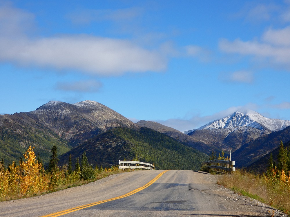 „Das ist er also. Der Dalton Highway… “ Ruhig und friedlich liegt er da, während sich das Licht der untergegangenen Abendsonne golden rötlich in der feuchten Piste spiegelt. Ruhig und friedlich liegt er da, als hätte es die Schlammschlacht über Tag nicht gegeben. Fairbanks hatte ich bei trüb kühlem, aber trockenem Wetter verlassen. 100 km Asphalt und mit 1600 Höhenmetern direkt hügelig durch schöne, gelb bunte, herbstliche Birken- und Espenwälder und den Duft von feuchtem Herbstlaub in der Nase. Am zweiten Tag dann nochmal 37 km bis der Asphalt endete und der eigentliche Dalton Highway begann.