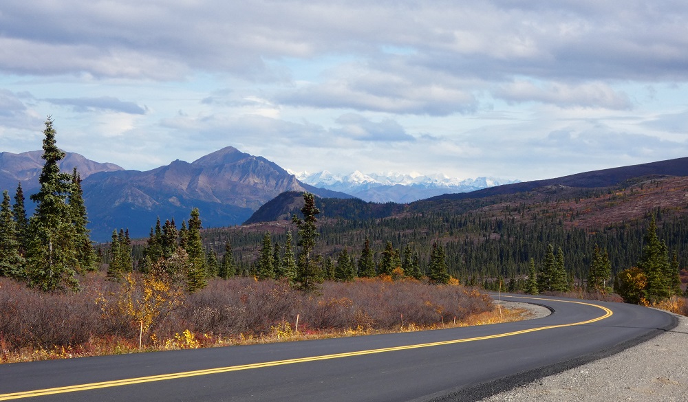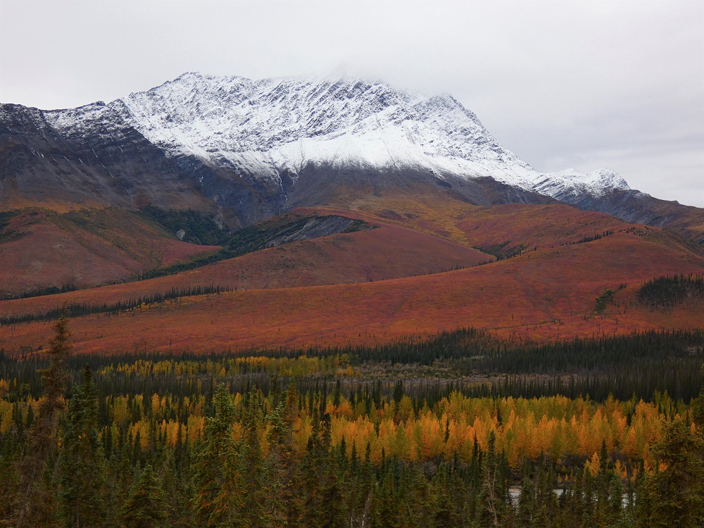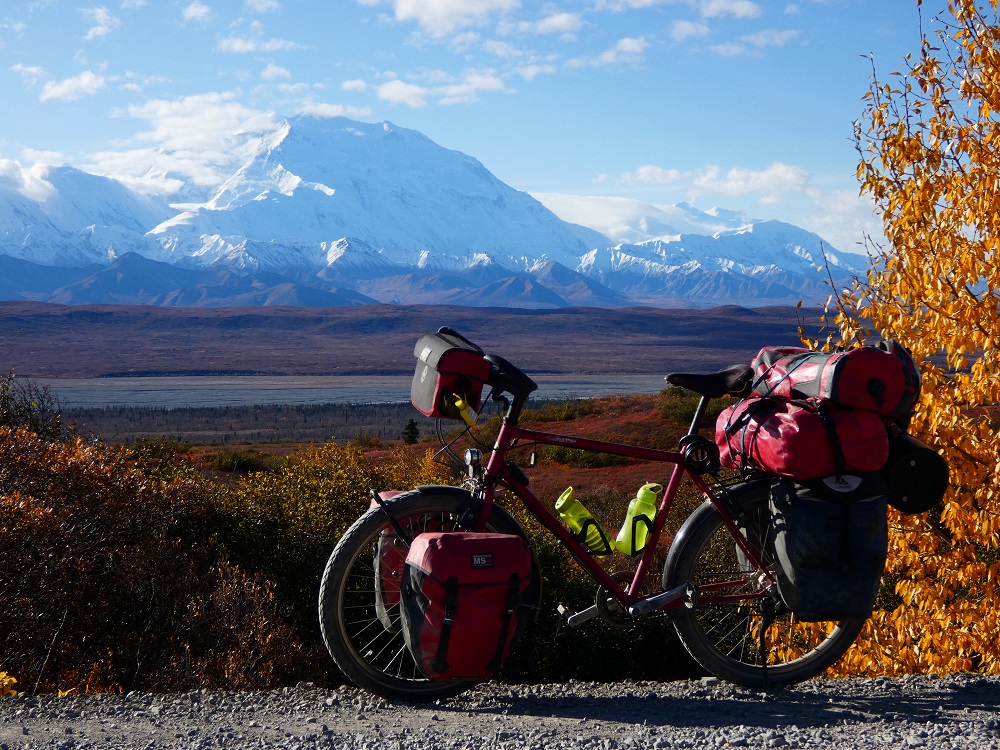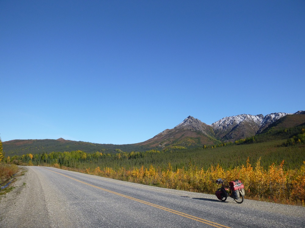 oder eben mit einem Bus des Parkservice. Der Camperbus ist speziell für Camper reserviert und da dies der letzte Bus der Saison ist, habe ich den ganzen Bus für mich. Sehr schön. Ich lasse mich drei Viertel in den Park hinein aussetzen, fahre ab dort die restlichen 35 km bis Wonderlake selbst. Gleich ein viel schöneres Erlebnis als im Bus und zum Nachmittag kommt immer mehr die Sonne heraus und der Berg zieht frei. Was für eine Koloss. Wonderlake liegt nur auf 500 m Höhe und so ragt die 6120 m hohe Wand des Mt. Denali (früher Mt. McKinley) fast monolithisch aus der Ebene steil auf. Die knackig kalte Nacht verbringe ich auf dem geschlossenen und menschenleeren Wonderlake Campground und wache morgens bei klarem Himmel auf, genieße mein Frühstück mit Blick auf den Berg und fahre dann langsam, viele Fotos knipsend in Richtung Parkausgang. Leider gibt es zum Abschluss der Saison immer die Roadlottery wo an vier Tagen eine bestimmte Anzahl Tickets verlost werden, so dass man mit dem Auto die sonst gesperrte, 145 km lange Parkstraße befahren darf. Somit ist es leider nicht mehr so ruhig wie am Vortag, aber schön bleibt es trotzdem. Die zweite Nacht im Park darf ich auf einer Couch in einem Parkcamp verbringen, wo die Mitarbeiter auf halber Strecke untergebracht sind. Eine heiße Dusche und ein warmes Zimmer waren sehr willkommen, da den ganzen Tag ein eisiger Wind pfiff. Der dritte Tag im Park ging dann über ein paar kleinere Pässe mit 1300 m durch karge Landschaft, bis ich am Abend den Campingplatz am Parkeingang erreichte. Viele Tiere habe ich leider nicht gesehen. Einige Grizzlys in der Entfernung, die am Berg nach Futter gruben und einen Elchbullen. Ein majestätisch mächtiges Tier. Alles in allem aber trotzdem nochmal ein toller, richtig lohnenswerter Abstecher (vor allem, wenn man nicht im Bus sitzen muss, wie die ganzen normal Touristen).