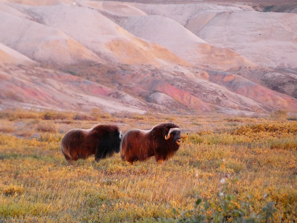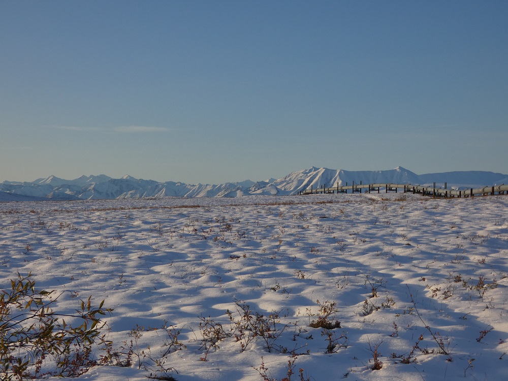 Einzige Tankstelle entlang der Strecke nach 400 km und einzige Übernachtungsmöglichkeit für Reisende. Hotelkosten für eine Nacht 239 Dollar! Dafür darf man natürlich kein echtes Hotel erwarten, sondern man bekommt eine beheizte Kammer. Immerhin die Dusche ist in dem Preis inbegriffen. Die kostet im Einzelpreis sonst 14 Dollar. Willkommen im Basislager des Mt. Everest! Ich begnüge mich hier mit dem recht guten Abendbuffet für 20 Dollar und genieße es im Warmen zu sitzen. Es herrscht eine Atmosphäre wie auf einer Berghütte. Es gibt ja nichts zu tun und niemand ist hier in Eile. Es ist eine bunte Mischung aus Truckern, Camparbeitern, Jägern und einer Hand voll Touristen. Fremde Leute setzen sich zu einem an den Tisch und man hält Smalltalk. Gejagt werden hier oben Karibu und Bären. Man klopft sich gegenseitig auf die Schulter, wenn man mal wieder einen Bock geschossen hat und politisch ist man eher konservativ. Man freut sich über den Bau einer neuen Pipeline, die nun unter neuer Administration in Washington endlich möglich wird und „nur aus vorgeschobenen Umweltgründen“ bisher blockiert wurde. Man lebt hier halt in einer anderen Welt, aber sehr nett sind die Leute trotzdem. Als i-Tüpfelchen auf einen ohnehin schon tollen Tag gibt es am Abend noch Polarlichter, die über meinem Zelt tanzen. Manchmal statisch, manchmal wie im Wind wehende Vorhänge und manchmal in Strahlen, die gleich einer Kette fallender Dominosteine vom Himmel hinabschießen. Ganz nett anzuschauen, aber bei weitem nicht so spektakulär, wie man sich das vielleicht vorstellt. Weiter durch schöne Herbstfarben geht es in Richtung Pass. Die Brooks Kette muss überquert werden und auf matschiger Straße arbeite ich mich dem 1446 m hohen Übergang entgegen, während der Schnee rechts und links immer mehr zunimmt. Nach 120 km, 1700 Höhenmetern und 8h 43 min Fahrzeit mache ich für den Tag Schluss. Durch schöne Winterlandschaft fahre ich, singe und pfeife in bester Weihnachtsstimmung „Walking in a Winter Wonderland“ bis ich mir selber auf die Nerven gehe, dann den Song aber nicht mehr aus dem Kopf bekomme, campe wieder an der Pipeline, zeige brav meine Permit vor, als ein Security Mann mich verscheuchen will und genieße am nächsten morgen wieder ein Frühstück im Schnee und bin überrascht, als der Wachmann wieder angefahren kommt, diesmal, um mir eine große Tüte mit Snacks in die Hand zu drücken und mir frisches Wasser für den Weg zu bringen. Toll! Mit jedem Kilometer weiter nach Norden schwindet der Schnee immer mehr und die darunter liegende arktische Tundra kommt zum Vorschein. Sehr karge Landschaft. Die letzten Bäume habe ich noch vor dem Pass gesehen, aber trotzdem ist es irgendwie schön im Sonnenschein hier oben unterwegs zu sein, fast wie im bolivianischen Altiplano. Mit dem Abend kommt allerdings kräftiger Wind auf und eine Wolkendecke. Gerade habe ich mein Zelt aufgebaut, da zieht ein strenger Geruch herüber und ich höre Getrampel hinter dem Gebüsch, dass ich als Windschutz gebrauche.