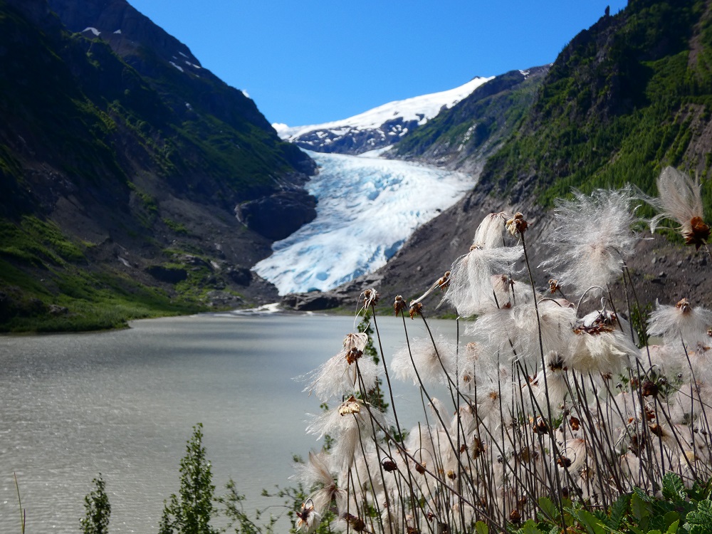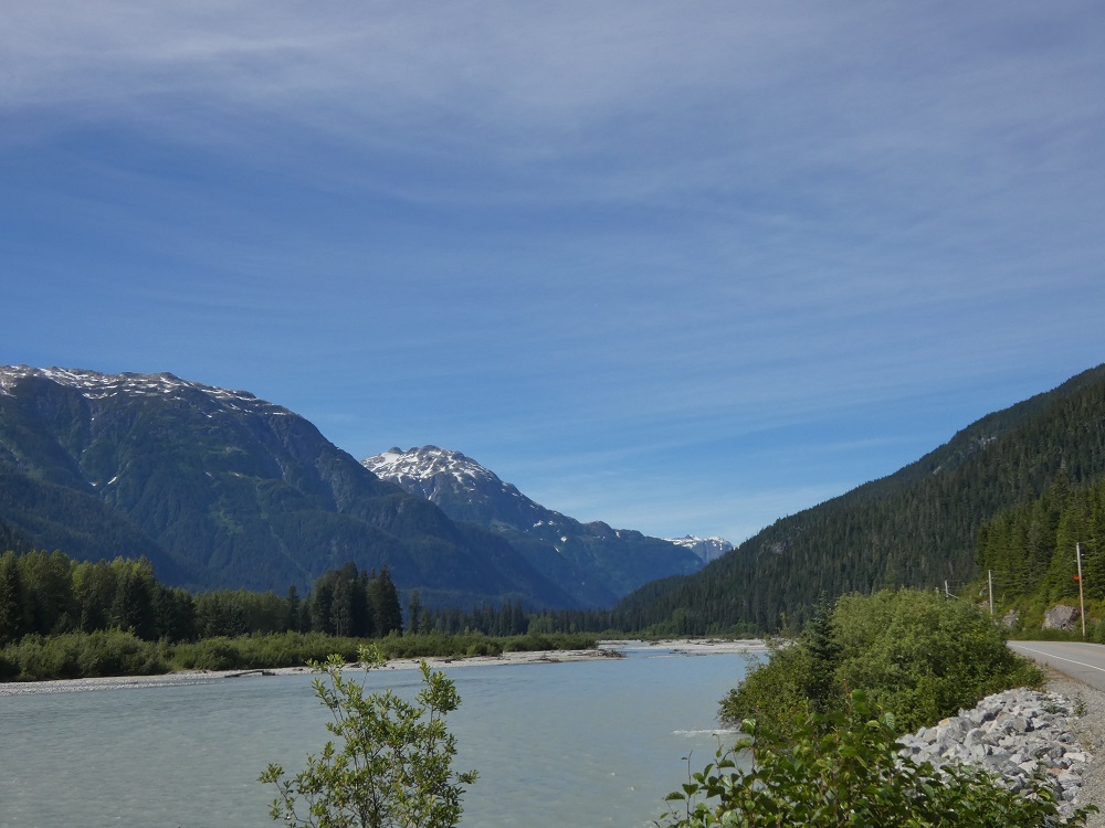 Ein kleiner Abstecher von ca. 150 km führte mich auf eine Schnupperrunde nach Hyder, Alaska. Es war der erste schöne Sonnentag und durch tolle Landschaft ging es an Gletschern, die bis zur Straße hinunterkamen, an Seen und Bächen vorbei in Richtung Küste. Hyder ist ein kleiner Ort, nur so gerade über die Grenze nach Alaska und weil die Straßen dort nirgends hinführen, gibt es noch nicht mal eine Grenzkontrolle. Wohl der einzige Grenzübergang, bei dem man ohne anhalten zu müssen in die
