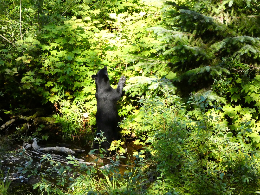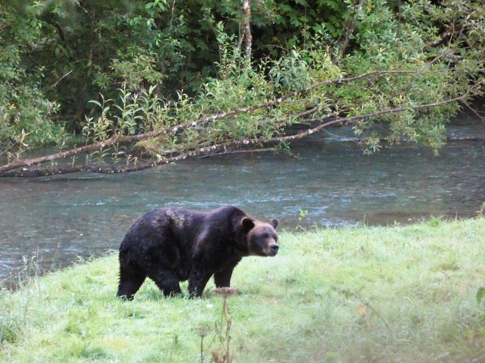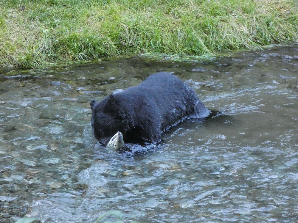 USA einreisen kann. Hyder ist eigentlich eine Geisterstadt und es gibt so gut wie nichts zu kaufen. Auf dem Campingplatz baue ich mein Zelt auf und fahre direkt weiter den Fluss hinauf zu einer Aussichtsplattform. Dem eigentlichen Grund meines Besuches hier. Von dieser Plattform aus kann man völlig risikofrei, da ein paar Meter über dem Fluss, Bären beim Lachsefischen beobachten. Also eigentlich. Denn viel Geduld ist gefragt. Auch wenn man durch die Plattform ein bisschen das Gefühl hat im Zoo zu sein, so ist man doch in der freien Natur und da kommen die Bären eben nicht zu bestimmten Fütterungszeiten, sondern so, wie sie Lust haben. Und das erfordert eine ganz schöne Ausdauer auf Seiten der Beobachter. Manchmal dauert es zwei Stunden oder länger, bis sich mal ein Bär blicken lässt und im schlechtesten Fall fängt er direkt einen Fisch und verschwindet innerhalb von einer Minute wieder im Gebüsch. Oder er entscheidet sich 200m flussabwärts zu fischen. Auch doof. Und dann dauert es wieder… und dauert… und dauert… bis der nächste Bär kommt. Die Wartezeit überbrückt man mit Gesprächen mit anderen Reisenden in gedämpftem Ton, oder man meditiert so ein bisschen vor sich hin. Es herrscht dabei eine sehr ruhige und disziplinierte Atmosphäre. Und dann gibt es sie eben doch auch. Diese Momente, wenn ein Bär sich entscheidet direkt unter der Plattform zu fischen, mit einem Satz ins Wasser stürzt oder wild rennend den Lachsen hinterherjagt, die panisch durchs Wasser schießen. Aber am Ende erwischt es immer einen. Die Jagdhirarchie ist dabei ganz klar, wenn mal mehrere Bären zugleich am Bach auftauchen. Junge Bären machen älteren Platz, Weibchen den Männchen und wenn ein dicker Grizzly den Bach hinab marschiert, da rennt auch der größte Schwarzbär so schnell davon, als ginge es um sein Leben. Und Grizzlys sind wirklich beeindruckende Brummer. Leider kamen die in der Regel erst später am Abend, als der gesamte Bach schon im Schatten lag. Das mindert natürlich nicht die Qualität des Erlebnisses, aber leider die der Fotos. Zwei Tage verbringe ich hier und ich muss sagen, der Abstecher hat sich wirklich gelohnt. Schon auf dem Weg nach Hyder hatte ich meinen ersten Bären am Zelt. Morgens, mein Wecker hatte gerade geklingelt, tatscht plötzlich etwas relativ kräftig am Kopfende gegen mein Zelt. Sofort war mir klar, dass das nur ein Bär sein konnte.