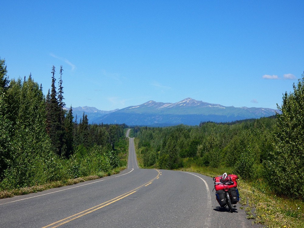 Je weiter ich nach Norden fortschreite, umso mehr nimmt der ohnehin schon geringe Verkehr ab. Ab der Hälfte des Cassiar Highways verschwinden auch die Loggingtrucks und es kommt nur noch alle 15 Minuten ein Auto. Das ist ein sehr angenehmes Fahren und die meiste Zeit fahre ich in der Mitte der Straße. Die pure Freiheit. Langsam ändert sich die Landschaft. Der Schnee verschwindet von den Bergen, Straßen zu Minen zur Jade, Gold, Silber und Kupfergewinnung zweigen von der Hauptstraße ab. Bergbau ersetzt hier die Forstwirtschaft. Der dichte Wald, der gefühlt ganz Kanada zu bedecken scheint, besteht hier nur noch aus dünnen Bäumen, die sich nicht gewinnbringend nutzen lassen. Irgendwann erreiche ich die Kreuzung zum Alaska Highway. Hier herrsch wieder mehr Verkehr, ist es ja auch die Hauptverkehrsader in Richtung Whitehorse. Die erste Stadt (27 000 Einwohner) nach Terrace (11 000 Einwohner), das nun über 1000 km zurück liegt. Nach 27 695 km muss ich hier mein Tretlager tauschen lassen, das auf den letzten 300 km etwas Spiel entwickelt hat. Ist aber kein großes Problem und wird zum Selbstkostenpreis innerhalb von 30 Minuten gegen das identische, das hier zufällig vorrätig war, getauscht. Vielen Dank an Cadence Cycling in Whitehorse für diesen tollen Service! In Whitehorse besuche ich Jörn und Melissa, die ich in Yucatan kennengelernt habe und die mich zu sich eingeladen hatten, sollte meine Reise mich durch Whitehorse führen. Mit Steak vom selbstgejagten Elch vom Grill sowie frischem Gemüse aus dem Gewächshaus werde ich sehr herzlich Empfangen und es gibt ein freudiges Wiedersehen. Leider brechen sie am nächsten Tag zu einer Deutschlandreise auf, aber ich darf für die nächsten Tage auf das Haus und die Katze aufpassen und die tolle Terrasse mit den gemütlichen Sitzmöbeln genießen. Toll, nach so langer Zeit mal wieder in einem richtigen Haus zu wohnen (sowie endlich mal wieder einen Kühlschrank zu haben, eine warme Dusche, ein Bett, eine voll ausgestattete Küche, in der man auch anderes als die immer gleichen Nudeln mit Fertigsauce kochen kann und ein Auto zum bequemen Einkaufen in der 18 km entfernten Stadt). Vielen vielen Dank an Jörn und Melissa mit Jakob für das entgegengebrachte Vertrauen und dass ich eine so schöne Zeit in eurem tollen Haus genießen durfte. Bis zum nächsten Mal…