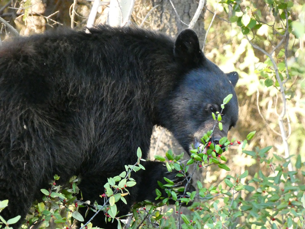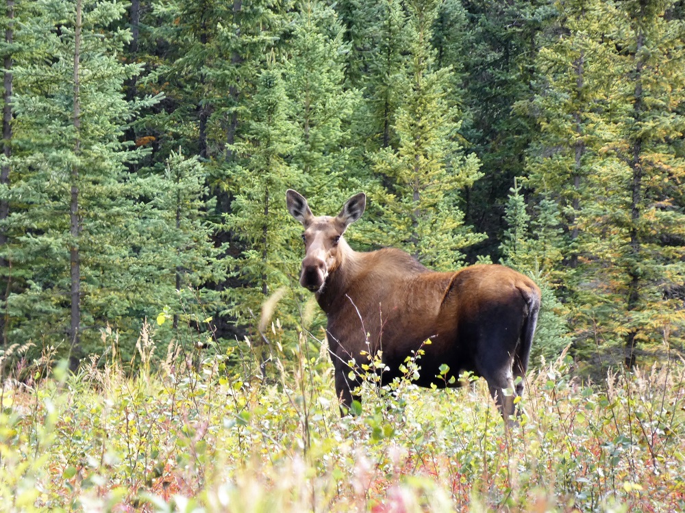 zotteliges Pony hier draußen, mitten in der Pampa?“ Total verwundert fahre ich ein bisschen näher, als das grasende Pony aufschaut. „Shit! Kein Pony! Grizzly!“ Schnell fahre ich ein Stück weiter, da ich deutlich näher an dem sichtlich nervösen Tier war, als gewünscht. Nach 20 Metern drehe ich mich nochmal um. Da laufen drei junge Bären auf die Straße und die Mutter stellt sich auf die Hinterbeine. Die Kleinen tuen es ihr gleich. Wie süß. Am liebsten würde man die drei kleinen in eine Uniform stecken und ihnen ein Hütchen aufsetzen, aber die Zeit der Tanzbären ist ja zum Glück vorbei. Lieber entferne ich mich noch ein Stück weiter. Ganz geheuer ist mir die Nähe nicht, denn gerade bei Bärenmüttern mit Jungen ist Vorsicht geboten und Grizzlys gelten dazu auch noch als deutlich angriffslustiger als die relativ harmlosen und scheuen Schwarzbären. Aus einer sicheren Entfernung von vielleicht 60 m kann ich dann noch schnell ein etwas unscharfes Foto schießen, bevor die Bärenmutter mit ihren Kleinen im Schlepptau auf der anderen Straßenseite im Gebüsch verschwindet. Ein tolles Erlebnis.