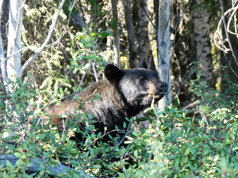 Ich rufe „Hey“, klatsche in die Hände und stecke meinen Kopf aus dem Zelt. Verdutzt schaut mich der Bär an und macht ein paar schnelle Schritte zurück und blickt mich wieder an. Ich klatsche noch zwei Mal in die Hände und er verschwindet im Dickicht, aus dem er kam. Toll, aber so nah muss dann doch nicht sein… So bekomme ich auf den nächsten 800 km fast täglich mindestens einen Schwarzbären zu Gesicht, nur leider sind sie sehr scheu und laufen meist davon, wenn sie mich sehen. Ein Auto ist hier echt von Vorteil. Das kennen sie und so nehmen sie es nicht als Gefahr war. Man muss daher sehr langsam, ruhig und vorsichtig vorgehen, wenn man sich einem Schwarzbären nähert. Dann gelingt es auch manchmal eine ganze Zeit beobachtend in unmittelbarer Nähe zu stehen, während sich der Bär an roten Beeren labt, die er flink mit der Zunge vom Strauch leckt, dabei nur ab und an zu einem aufblickt und dann in aller Ruhe weiterfrisst. Das Erlebnis ist dabei viel intensiver, weil man unmittelbar da ist. Mit beiden Beinen auf der Straße, ohne eine schützende Barriere oder eine Autoscheibe zwischen der Natur und einem selbst. So gefällt mir das. Ähnlich schön am nächsten Tag mein Mittagessen. Wie so oft halte ich an einer Haltebucht an um meine Dose Thunfisch mit Tortilla Wraps zu essen. Ein Schwarzbär hatte gerade die Straße überquert und beobachtet mich durch die Büsche für eine halbe Stunde, während er immer wieder selbst nach Wurzeln gräbt und Gräser frisst, oder sich entspannt in der Blumenwiese wälzt. Diese Erlebnisse gepaart mit wirklich schöner Landschaft aus schneebetupften Bergen, Seen und viiiiiel Wald machen diesen Reiseabschnitt zu einer tollen Fahrt. Erwartet hatte ich mir hier eigentlich überhaupt nichts und so bin ich mal wieder positiv überrascht. Jeder Hügel und jeder Pass bietet eine neue Aussicht. Wieder mal toll! Wie schon so oft. So wie auch meine Biberbegegnung. An einem der zahlreichen Flüsse habe ich meine Wasserflaschen gefüllt, als ich an einem kleinen Teich einen Biber schwimmen sehe. Ich beobachte ihn für eine Weile, während ich in der Nähe ein konstantes Nagegeräusch höre, das Tier dazu aber nicht sehen kann. Nach einer Zeit taucht die Biberdame auf, gibt ihrem Bibermann ein Küsschen (zumindest scheint es so), beide verschwinden unter Wasser und in ihren Biberbau und eine Minute später höre ich das laute
