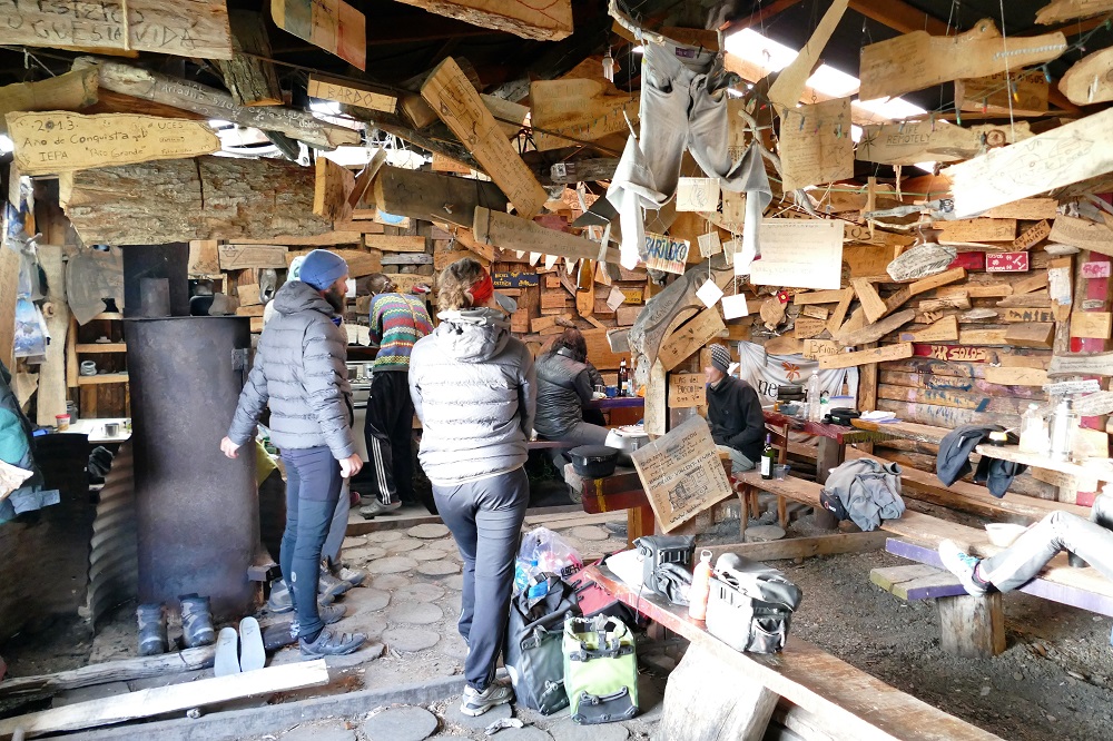 Diese Nacht verbrachte ich mit zwei Schweizern, die ich kurz zuvor im Park getroffen hatte, auf einem freien Campingplatz. Ab dem nächsten Tag gab es aber nur noch eine Vorzugsrichtung: Auf nach Norden! Zusammen machten wir uns mit einem kurzen Einkaufstopp in Ushuaia auf den Weg nach Tolhuin. 120 km immer wieder mit leichten Anstiegen bis auf 420 m und immer noch ziemlich kalt und bewölkt und mit Wind aus wechselnden Richtungen. Die nicht überraschende Erkenntnis nach diesem Tag: Ich bin zu schwer. Zumindest macht sich das Gewicht meines Gepäcks an jedem Anstieg deutlich bemerkbar und die Schweizer sind mit nur halbem Gewicht an den Steigungen deutlich flotter. In Tolhuin fanden wir einen einfachen Campingplatz mit leider nur lauwarmer Dusche aber uriger Kochhütte mit Holzofen, an dem ich mich erstmal aufwärmen musste, war ich nach dieser Etappe doch ziemlich durchgefroren. Das Zelt wurde in kleinen Holzverschlägen aufgestellt, die Schutz gegen den recht kräftigen Wind boten.