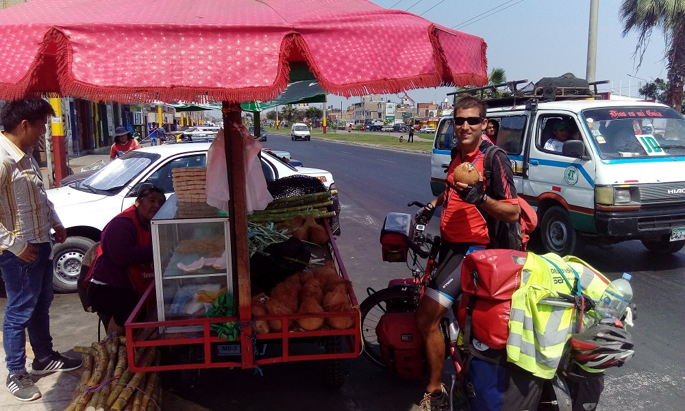 Kokosnuss. Etwas mehr als ein halber Liter kommt aus einer großen Nuss für 50 cent und ist dabei sehr erfrischend. Immer noch nicht genug? Dann gibt es noch einen frisch gepressten Orangensaft oder einen Fruchtsmoothie mal pur oder mit Milch gemischt, oft noch mit zusätzlichem Zucker gesüßt obendrauf! Hungrig? Die Peruanische Küche läuft hier zur Hochform auf. Für weniger als 2 Euro gibt es eine große Suppe und und als Hauptgang meist einen großen Teller den man aus einer Vielfalt verschiedener, allesamt leckerer, nie vegetarischer Gerichte wählt. An der Küste entschied ich mich meistens für Fisch oder ein Rindfleischgericht. Spätestens im Norden Perus stand auch jeden Tag eine Portion Ceviche (Cebiche je nach Region) auf dem Speiseplan. Mal sauer, mal scharf in Limettensaft marinierter, roher Fisch mit Zwiebeln. Wenn Pisco das Nationalgetränk der Peruaner ist, so sind Ceviche das Nationalgericht.
