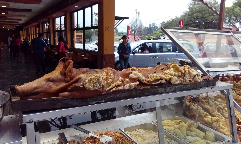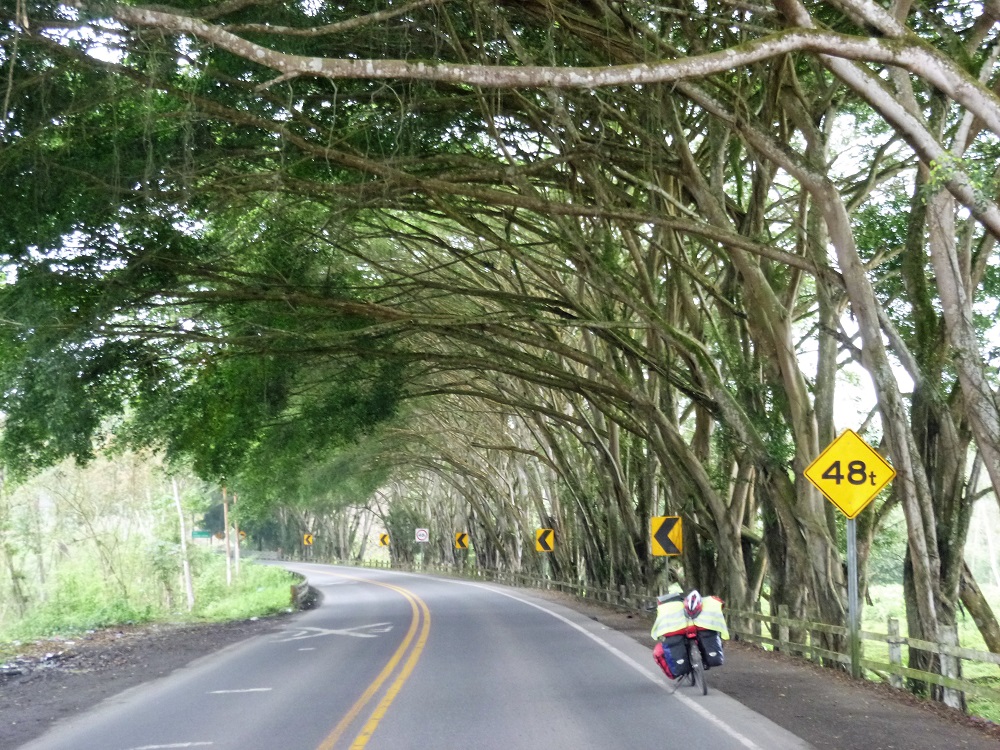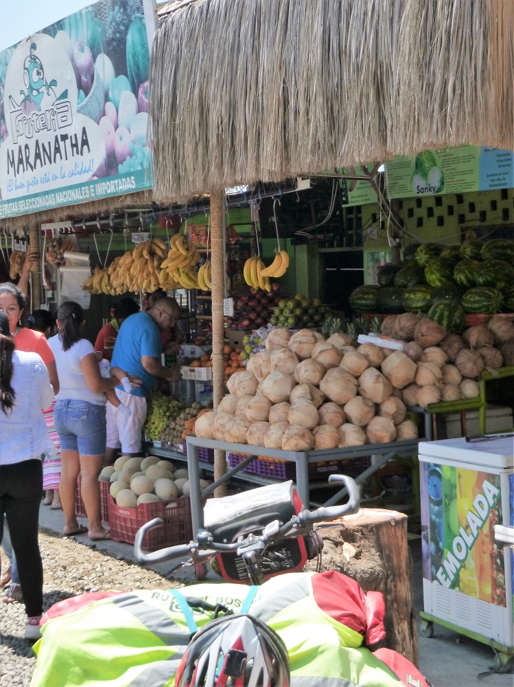 an Litschi)und knabber das Fruchtfleisch von Früchten aus riesigen Schoten. Aber es gibt auch noch immer die Straßenverkäufer, die Straßenstände mit Essen und das Mittagessen mit Suppe und Hauptgericht. Gleichzeitig ist das Land deutlich wohlhabender als das arme Nachbarland. Sah man in Peru hauptsächlich Lastwagen verschiedener Größe auf der Straße und unzählige Mototaxis in den Orten (Motorrikschas) bzw. für den öffentlichen Nahverkehr (bis 150 km) sogenannte Collectivos (Minivans/Sammeltaxen) oder Fernbusse, was insgesamt zu einem relativ geringem Verkehrsaufkommen führte, so sind die Ecuadorianischen Straßen voll von privaten Fahrzeugen, überwiegend aus Nordamerikanischer oder Asiatischer Produktion. Die Fahrweise ist mindestens genauso rücksichtslos wie in Peru und jeder scheint das maximale aus seinem Auto herausholen zu wollen. Auf europäischen Alpenpässen wären Ecuadorianer definitiv kein Hindernis. Im Gegenteil. Auch nur der geringste Geschwindigkeitsüberschuss wird zum Überholen genutzt. Dass dies auch in Kurven und anderen unübersichtlichen Stellen geschieht, versteht sich dabei von selbst. Zur Not passen auf einer schmalen Straße ja auch mal drei Fahrzeuge aneinander vorbei, wenn sich die außen fahrenden maximal an den Straßenrand drängen. Auch in Ecuador trifft man auf freundliche Leute. An einem Tag werde ich, als ich an einer Hochzeitsfeier mit dem „Ich könnte jetzt auch ein Bier vertragen“ Blick vorbeifahre tatsächlich auf ein Bier eingeladen, muss dann noch eine halbe Stunde in meinen verschwitzten Radklamotten Salsa und Merengue tanzen wozu ich weitere Biere aufgedrängt bekomme, bevor ich mich dann aus der Affäre ziehen kann um noch die restlichen 10 km zu radeln. Neben einem Haus campend werde ich dann freundlicherweise noch zum Abendessen in einem nahen Restaurant eingeladen und um das Frühstück musste ich mich auch nicht kümmern.