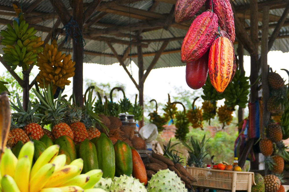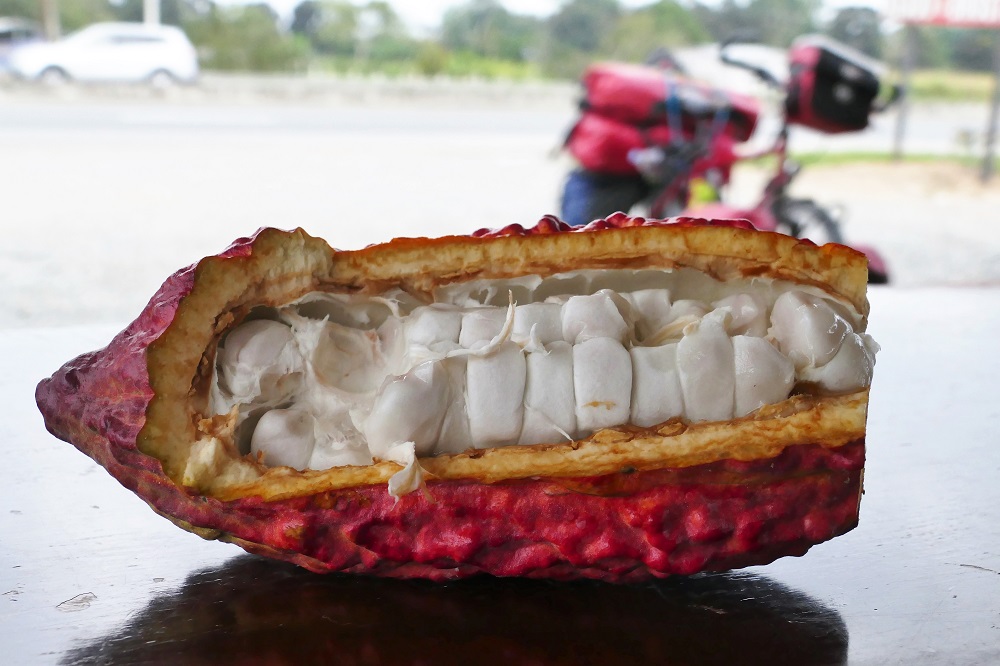 .…und dann kommt man nach Ecuador. Die Kokosnuss kostet plötzlich 1,50, der Himmel ist bedeckt, es ist schwül heiß und man fährt den ganzen Tag durch Bananenplantagen, die nur ab und zu von Kakaoplantagen unterbrochen werden. Trotzdem ist das Ganze noch ganz gut auszuhalten. Alles ist nun exotisch anders und doch vertraut. Ich probiere meine erste frische Kakaofrucht (das Fruchtfleisch um den Kern kann man ablutschen und erinnert