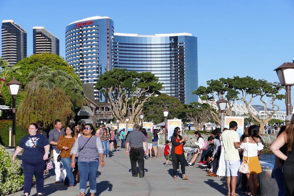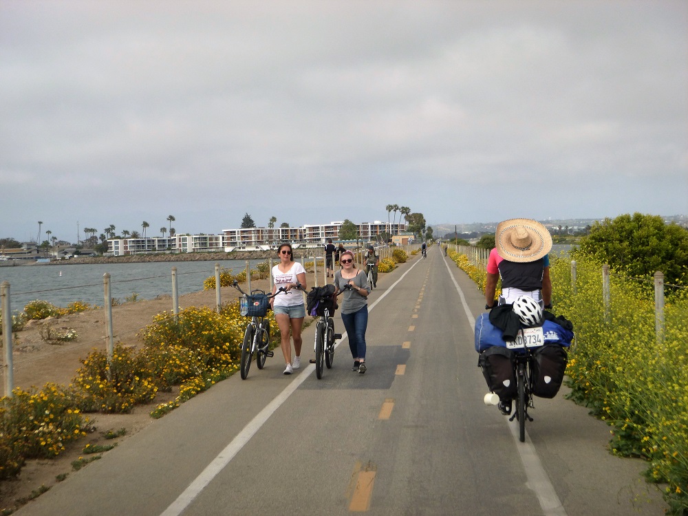 US- Einreiseschalter. Nirgends haben wir die mexikanische Grenzstation entdeckt, wo wir uns unseren offiziellen Ausreisestempel hätten holen und die 25 Euro Ausreisegebühr hätten abdrücken müssen. Das war mir bisher noch nie passiert. Aber sei’s drum, sagten wir uns. Wir hatten keine Lust zurück zu gehen um einen mexikanischen Grenzbeamten zu suchen, der uns vielleicht hätte weiterhelfen können, oder auch nicht… 25 Euro und viel Zeit gespart, entschieden wir uns einfach es darauf ankommen zu lassen, uns bei der nächsten Reise nach Mexiko, wann auch immer das sein mag, eventuell erklären zu müssen. Der Grenzübergang selber verlief dann völlig problemlos und niemand wollte unser Gepäck durchwühlen, was meine größte Sorge war, bei den Mengen von Gepäck, die ich mitführe. Ein paar kurze Fragen und der Stempel für 6 Monate war im Pass. So einfach kann das sein. Und dann betritt man eine ganz andere Welt. Alles ist sauber, es ist viel ruhiger, alles ist offener und die Menschen leben in ihren Häusern nicht hinter Gittern. Man kann endlich mal wieder aus dem Wasserhahn trinken und das Toilettenpapier in der Schüssel versenken anstatt es in einen Papierkorb daneben zu schmeißen. Die Autofahrer sind höchst rücksichtsvoll unterwegs und mit dem Fahrrad hat man immer Vorfahrt. Wenn man als Fußgänger nur mal schnell auf die andere Straßenseite laufen möchte, löst man einen Stau aus, weil alle Spuren anhalten, anstatt einfach mit gleichmäßiger Geschwindigkeit weiterzufahren. Auch hupt oder schimpft keiner. Alle sind völlig entspannt. Dabei würde ich mir meine Lücke doch schon suchen und dann zum richtigen Zeitpunkt schnell rüberlaufen, ohne den Verkehrsfluss zu behindern. Na ja. Jetzt nehme ich hier eben auch öfter den Fußgängerüberweg und warte sogar manchmal bis es Grün wird. Man passt sich eben an… Unser erster Weg führte uns erstmal zur direkt an der Grenze gelegenen „Mall of the Americas“. Endlich mal wieder richtig shoppen gehen stand auf der Agenda. Für den ersten Abend hatten wir eine Einladung in einem der Yachtclubs von Coronado, dem Nobelvorort von San Diego. Dort hielt ein älteres Ehepaar, bei dem wir eingeladen waren, einen Vortrag über ihre Radreise entlang der Route 66. Drinks und gutes Essen (Prime Rib Steaks) inklusive und da wollten wir natürlich ordentlich angezogen sein. San Diego ist eine ganz nette Stadt mit vielen Restaurants und Bars, einer Uferpromenade mit Shops und historischen Museumsschiffen, vom dreimastigen Schoner bis zum Flugzeugträger. Eine Stadt, in der man problemlos mal einen halben Tag verbringen kann. Nach einem Pausentag ging es gemütlich, auf gut ausgeschilderten Radrouten und guten Fahrradwegen, die Küste hinauf. Immer durch dicht besiedeltes Gebiet mit vielen Villenvierteln, die die ganze Küste säumen. Hier verwirklicht sich jeder auf seine Weise. Vom schlichten Bauhausstil, über Mediterrane Villen mit Zypressenauffahrt bis zu verspielten Disney Märchenhausfantasien.