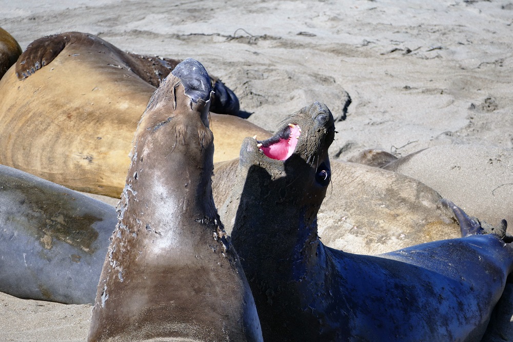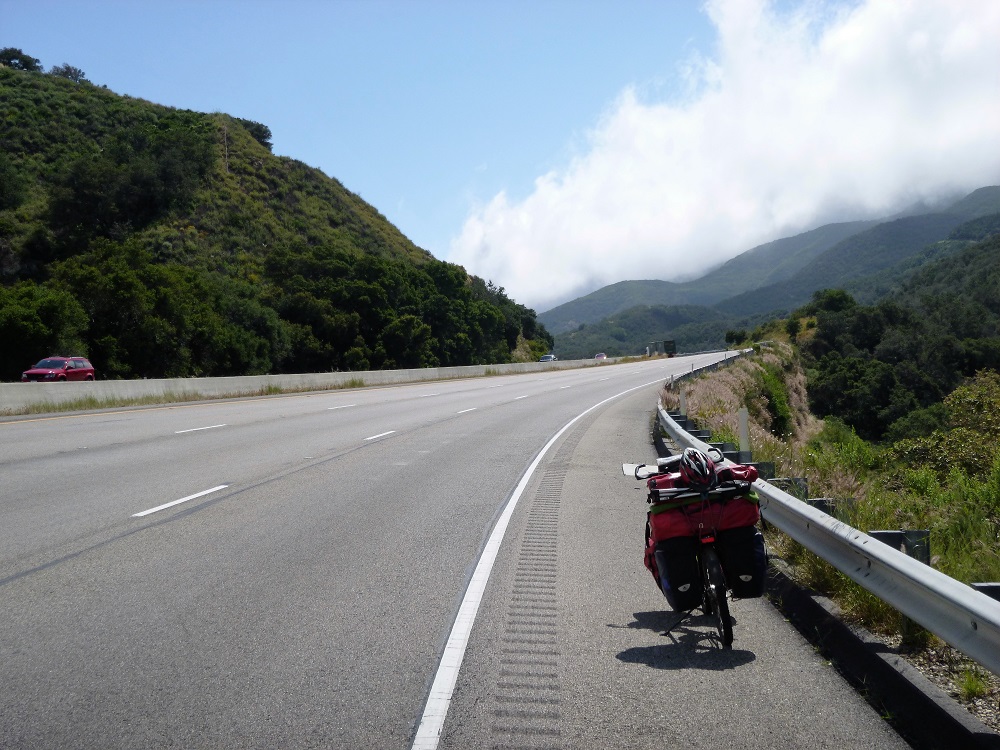egann. Die Besiedlung nahm spürbar ab. Die Strecken zwischen den Städten wurden etwas länger und erste Erdbeerfelder entlang der Straße tauchten auf, wo Mexikaner, die hier die Hälfte der Bevölkerung stellen, Arbeit finden. Entsprechend unterhalte ich mich in den meisten Läden oder auf der Straße noch auf Spanisch, nur um noch etwas in Übung zu bleiben. Santa Barbara ist dann wieder ein ganz nettes Städtchen, das nach einem großen Erdbeben komplett im andalusischen Stil wieder aufgebaut wurde. In San Luis Obispo werde ich spontan im Café eingeladen den Abend in der Stadt zu verbringen und mir die Stadt und den Farmers Market anzuschauen. Aufs Grillen (BBQ) verstehen sich die Amis übrigens ganz ausgezeichnet und danach gab es noch ein paar Bier bei toller Live Musik und mit tanzenden College Girls. Hier könnte ich problemlos leben. Aber natürlich muss ich mal wieder weiter. Nun geht es wirklich so richtig hinaus. Mehr Natur. Auf den legendären Highway 1. Ich wusste zwar, dass dieser ab Ragged Point gesperrt sein würde, hatte mir aber vorgenommen es trotzdem zu versuchen. Die Raue Küste entlang, die aufgewühlte See, die weiße Gischt sprühend an den Felsen anbrandet links von mir, rechts die sanften, grünen Hügel auf denen sich das lange Gras wie Wellen im starken Wind wiegt. Mächtig angestrengt kämpfe ich mich hier vorwärts. Kleine Highlights entlang der Strecke sind die immer wieder auftauchenden Delfine und Grauwale sowie die Seeelephantenkolonien, wo die Tiere mit den hässlichen Nasen zu hunderten die Strände belegen wie die Deutschen die Mallorquinischen Strände im Sommer.