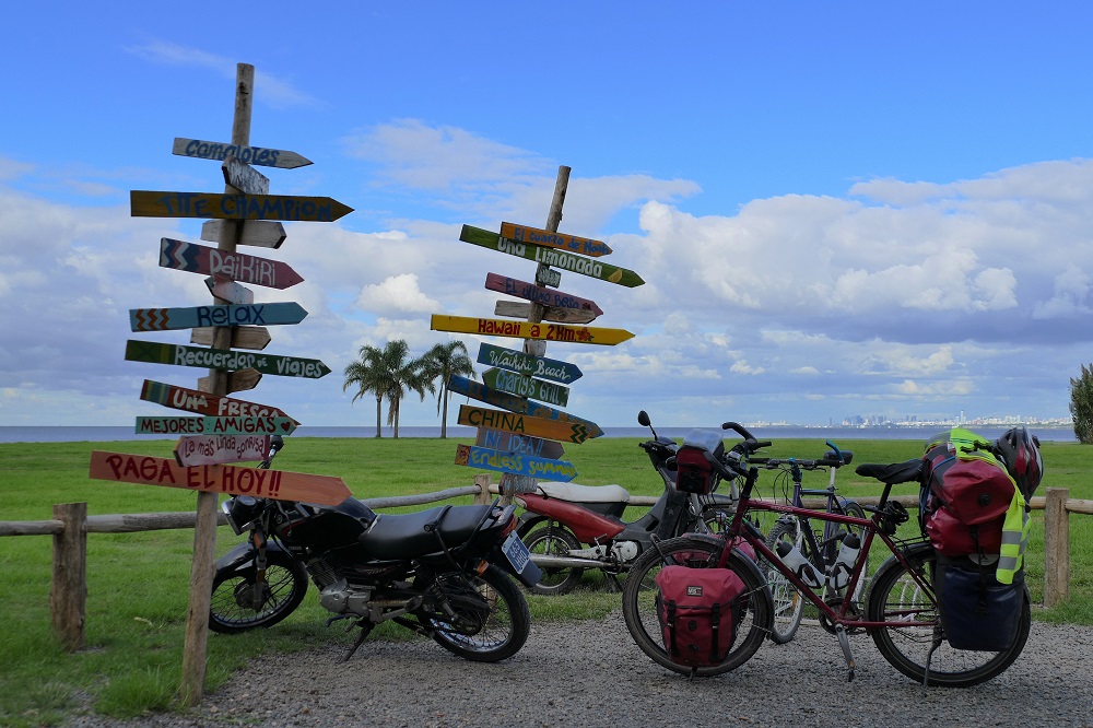 Nach dieser Woche Entspannung sitze ich wieder auf dem Rad. Es geht am Rio de la Plata entlang, dessen Mündungsdelta schon die Ausmaße eines Meeres hat, in Richtung Nord- Westen. Erst nach 70 km sehe ich den ersten kleinen Abschnitt unbebauter Fläche. Später biege ich in Richtung Nord- Nord- Ost ab. 150 km geht es topfeben durch Sumpfgebiete und große, überflutete Flächen. Rechts und links der Straße nur Wasser. Ein Großteil des Wassers stammt wohl noch von einer Überflutung von vor 3 Monaten. Immerhin die Nächte sind kalt und so gibt es keine Mücken mehr. Ich kreuze nach Uruguay und fahre in ständigem Auf und Ab durch nun trockeneres, intensiv landwirtschaftlich genutztes Gebiet. Auch immer mehr Palmen säumen meinen Weg. Nach einer kurzen Schnupperrunde durch Brasilien von Bella Union bis Uruguaiana komme ich wieder zurück nach Argentinien. An diesem Grenzübergang wird von einer übereifrigen Grenzerin mein komplettes Gepäck auseinander genommen, da sie meine Geschichte für nicht glaubwürdig hielt, dass ich seit über 4 Monaten mit dem Fahrrad unterwegs sei. Außerdem fand sie es höchst verdächtig, dass ich so häufig die Grenze zwischen Argentinien und Chile überquert habe anstatt jedes Land nacheinander zu bereisen. Alles Erklären und Diskutieren half leider nichts und so musste ich meine Taschen auspacken. Durch diese Zeitverzögerung konnte ich mein Tagesziel nicht mehr erreichen. Auf der Abkürzung die ich nahm um etwas Zeit gut zu machen, die sich dann aber als teils weiche Sandpiste herausstellte, wurde ich am Abend von einem Bauern eingeladen mein Zelt neben seinem Haus aufzustellen.