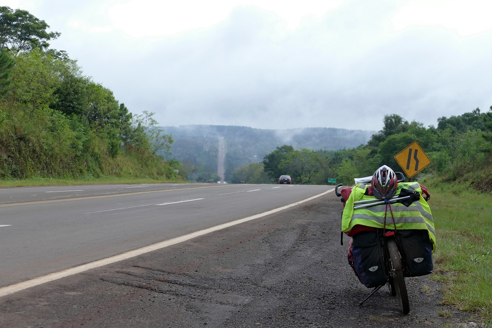 Weiter im Norden nun ging es wieder in ständigem Auf und Ab achterbahnartig durch die Provinz Missiones, leider auch mit viel Regen durch schwül warmen Regenwald in Richtung Iguazu. Auf diesem Abschnitt habe ich öfter wieder im Hotel geschlafen, da bei dem Klima keine Aussicht bestand das Zelt wieder trocken zu bekommen. Selbst die Hotelzimmer waren nicht wirklich trocken und die Bettwäsche war immer klamm. So wurde natürlich auch die Kleidung nicht mehr trocken und ich stieg jeden Morgen wieder in meine feuchte Radbekleidung. Nicht angenehm und von den geruchlichen Auswirkungen möchte ich hier gar nicht erst sprechen. Immerhin habe ich hier neben unzähligen bunten Schmetterlingen auch meinen ersten Tukan gesehen.