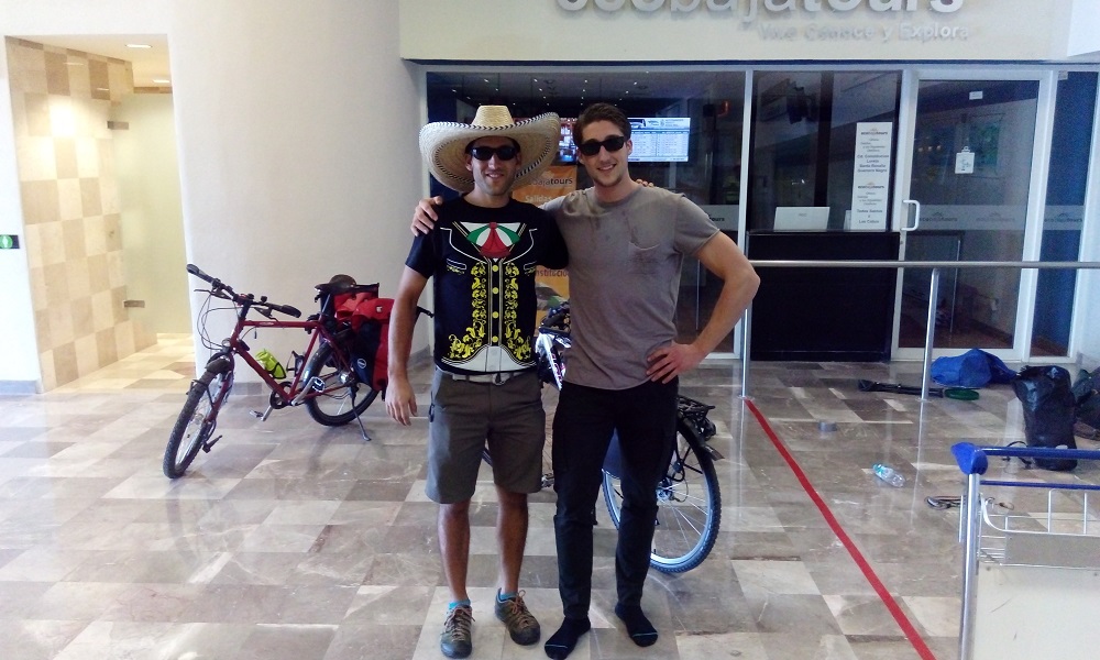 Schluss! Aus! Fertig! Rums! Die Reise ist zu Ende. Feierabend! Und bei der Mexikanischen Polizei sind wir auch noch aktenkundig geworden. Was ist passiert? Auf dem Kopf den größten Sombrero, den ich finden konnte, habe ich meinen Bruder am 04. April vom Flughafen in La Paz, Baja California abgeholt. Für ihn eine Wunschstrecke, auf die er sich lange gefreut hatte und die er, trotz Knieproblemen unbedingt mitfahren wollte. Knappe 1500 km Wüstenstrecke. Ständiger Gegenwind und viele Hügel und kleine Berge. Keine Touristischen Highlights. Kein Schnick Schnack. Ein Reinschnuppern in den normalen Radelalltag. Um ihm eine möglichst authentische Vorstellung davon zu geben, was so eine Radreise ausmacht, gingen wir zum Einstieg des ersten Tages früh morgens zum Strand, wo der Fischer, mit dem ich mich am Vortag verabredet hatte, schon auf uns wartete.