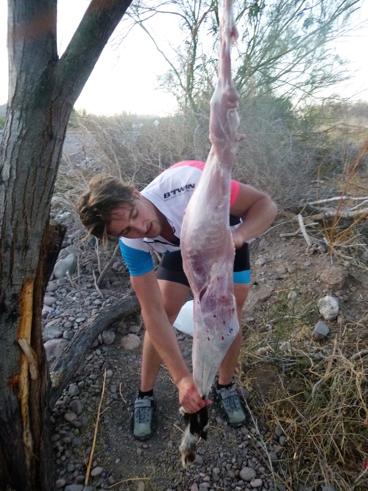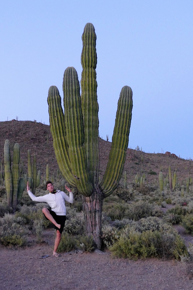 Kilometer nun schöner wurde und am Ende war die Halbinsel wieder überquert. Ein kurzer Fitnesscheck und der Beschluss, die 122 km bis zur Stadt noch voll zu machen bescherten uns ein unerwartetes Abendessen. Eine halbe Stunde zuvor überholte uns ein Pickup, dessen Ladefläche mit Zicklein völlig überladen, ja diese fast schon gestapelt waren. Dazu noch die landestypische, schlechte Ladungssicherung und so kam es wie es kommen musste. Mein Bruder, der ein paar Meter vor mir fuhr rief: “ Guck mal, die ist bestimmt vom Truck gefallen!“ Ich antwortete mehr im Spaß: „Super! Die ist ganz frisch! Lass essen!“ Mein Bruder, ganz begeistert von der Idee, drehte um und gemeinsam nahmen wir das Tier in Augenschein. So frisches Fleisch verkommen zu lasssen wäre echt eine Schande und nach kurzem Überlegen, hängten wir das Tier an einem Baum am Straßenrand auf und begannen damit die Haut abzuziehen. Es dauerte nicht lange und da wurden wir schon wieder unterbrochen. Die Polizei hatte gestoppt um zu schauen, was wir da trieben. Sie wollten wissen wo wir das Tier her hätten, kontaktierten das Revir, schauten nach, ob das Tier ein Tag habe (hatte es zum Glück nicht) oder von uns möglicherweise erschlagen worden war (war zum Glück auch keine äußere Gewalteinwirkung erkennbar) und so war alles in bester Ordnung. Zumindest gab das Revier grünes Licht, dass in diesem Fall keine Straftat vorläge und wir wurden aufgefordert weiterzumachen. Trotzdem wurde noch eine Kopie des passes angefertigt und es wurden Fotos für die Akten gemacht. Ich, freundlich in die Kamera lächelnd, mit meinem zerschlissenen Trikot und dem bescheuerten Vogelscheuchenstrohhut, den ich an diesem Tag auf der Straße gefunden hatte, mein Bruder mit breitem Grinsen, den Sombrero auf dem Rücken, das gezückte Messer in der Hand neben der halb abgezogenen Ziege posierend. Die wahrscheinlich besten Filephotos des gesamten Archivs und eine Story, die noch die nächsten Monate immer wieder erzählt wird, wenn die Polizisten Radreisende sehen… Mit etwas Gemüse als Beilage gab es auf jeden Fall ein üppiges Abendessen ab. Weiter hügelig ging es die Küste entlang, überfüllte Strände zum Campen inklusive. Es waren Osterferien und damit die Hauptreisezeit der Mexikaner. Wieder mal musste die Hauptkordillere überquert werden, dann 200 flache Kilometer durch unspektakuläre Wüste, mein Geburtstag und dann ging es hinein in die Traumlandschaft, an die jeder denkt, wenn er „Baja California“ hört. Riesige Cardon Kakteen, dazwischen Felsblöcke verschiedener Größe gestreut, wolkenfreier Himmel und Sonne den ganzen Tag, schlappe Geier am Wegesrand. Der wahre Zauber beginnt aber, wenn sich die Sonne langsam dem Horizont entgegensenkt. Die Zelte sind idyllisch zwischen Kakteen platziert. Im Gegenlicht zeichnen sich die großen Kakteen wie Scherenschnitte ab, während die haarigen Stacheln der kleinen rüsselartigen Kakteen im Gegenlicht golden und weich leuchten.