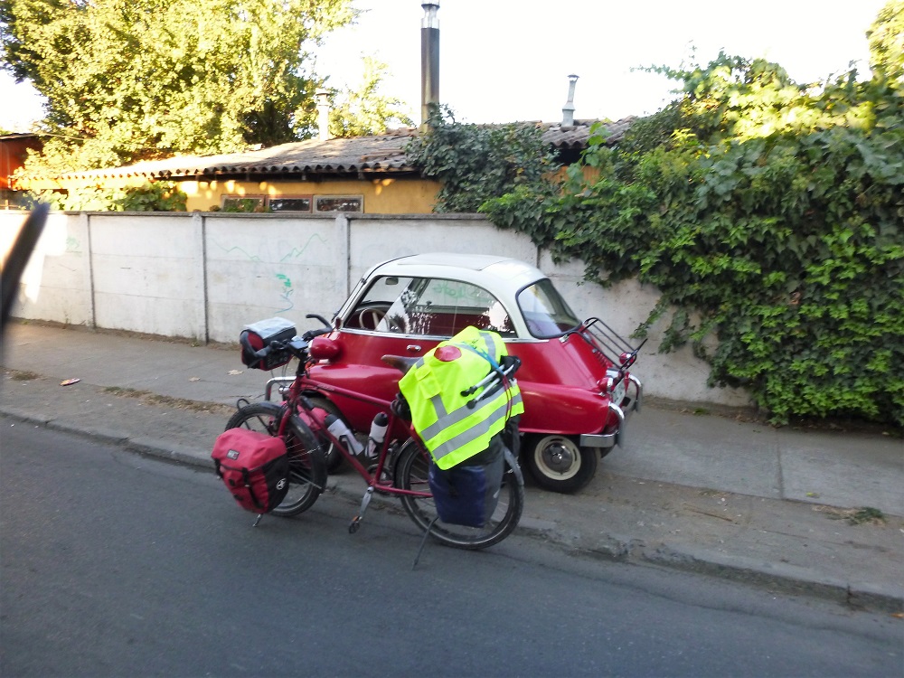 Im Tal angekommen schwang ich mich nochmal auf mein Rad und pedalte bis zum Sonnenuntergang noch 30 km in Richtung Autobahn, auf der es dann wirklich ohne weitere Umwege schnurstracks nach Norden gehen sollte. Schließlich wurde es auch schon merklich Herbst. In den Nächten gab es nun den ersten Frost, während die Tage noch angenehm warm waren. Die Blätter wurden mit jedem Tag ein bisschen bunter und die überall wuchernden Brombeerbüsche hingen nun so übervoll mit Früchten, dass selbst ich nicht mehr mit dem Essen hinterherkam. Also der Sonne hinterher, ab nach Norden. Mitten durch das Herzland Chiles, abseits der klassischen Touristendestinationen. Mitten durch das Gebiet, wo Chile vielleicht am chilenischsten ist. Die gesamte Strecke führte durch land- und forstwirtschaftlich geprägtes Gebiet. Hier wird alles angebaut und hergestellt, was Chile benötig. Fleisch, Getreide, Obst, Wein, Käse, Holz und Ziegel. P1100133Es gibt unzählige verarbeitende Betriebe und überall werden Maschinen und Zubehör zur Bestellung der Felder verkauft. Es wird an Gärkesseln geschweißt, Saisonarbeiter ernten die Felder ab und wo sie nicht nachkommen helfe ich ein kleines bisschen mit und esse meinen Anteil direkt von der Rebe. In der Regel bekomme ich das meiste Obst aber geschenkt oder kaufe es an einem der Fruchtstände zu extrem günstigen Preisen ein. Soviel Herzlichkeit wie auf diesem Abschnitt, der durch einen der ärmeren Teile Chiles führt, ist mir auf meiner bisherigen Reise noch nicht entgegengebracht worden. Einmal werde ich spontan zu einer Familie eingeladen und bekomme sogar noch die Matratze der Tochter zur Verfügung gestellt, am nächsten Tag bekomme ich fast ein Kilo Erdbeeren geschenkt, nachdem ich zwei Tage zuvor schon eine Melone, Tomaten und Brot bekommen hatte. Eine Mitarbeiterin einer Mautstelle stattet mich mit einer Warnweste aus, damit ich auf der Autobahn besser gesehen werde, eine ältere Frau an einer privaten Raststation schenkt mir ein Eis und bietet an mir noch ein Sandwich zu machen. In dieser Weise gibt es fast jeden Tag eine kleine Überraschung. Gleichzeitig fällt auf, dass in der Nähe größerer Städte viel neuer Wohnraum in Form von riesigen Wohngebieten mit 1000 gleichartiger Häuser geschaffen wird. Dazu Werbeplakate, die dazu auffordern die Familie auf das nächste Level zu bringen und ihr ein besseres Leben (durch den Umzug in solch eine Siedlung) zu ermöglichen. Da hier wahrscheinlich nicht am Bedarf vorbei gebaut wird, muss es also auch eine aufstrebende Mittelschicht geben, die hier offensichtlich angesprochen wird. Insgesamt fällt mir hier der Kontrast zwischen den verschiedenen Lebensstandards im Land deutlicher auf als auf meiner bisherigen Reise.