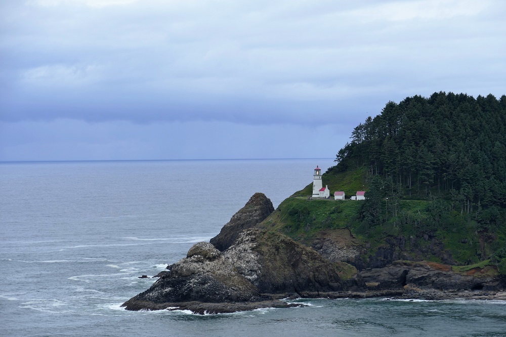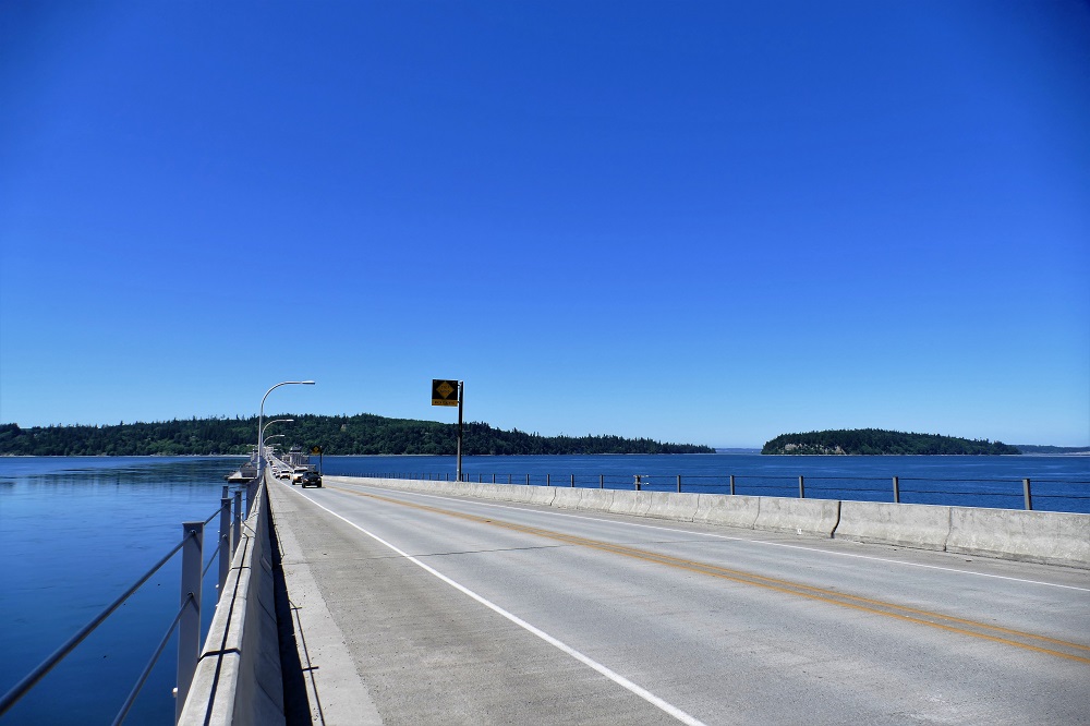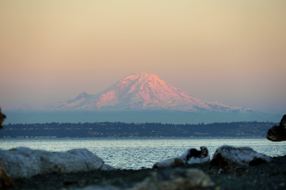 Am nächsten Tag finde ich einen Platz bei einer kleinen Bio Farm, wo ich die wohl coolste heiße Dusche auf der Reise bekommen habe. In einem kleinen Baumhaus in zwei Meter Höhe unter Mammutbäumen. Der Blick schweift über die weite Landschaft und über einem rauschen die hohen Baumwipfel während das von der kleinen Gastherme erhitzte Wasser über meinen Körper läuft. Die Gasflasche war gut gefüllt und so kann ich nicht einfach nur kurz duschen. Zu schön ist dieser Platz. Zum Abendessen bekomme ich alles an frischen Zutaten, was die kleine Farm hergibt. Frisch gemolkene Milch (super lecker und noch Euterwarm), irgendein Blattgemüse, das entfernt an Kohlrabi erinnert, Pilze, Rosmarin, Eier und Bunte Kartoffeln. Damit ließ sich ein wunderbar gesundes Abendessen zaubern und es war eine tolle Abwechslung zu meinen Spaghetti. Wieder mal Glück gehabt. Weiter durch Wald und nette Landschaft mit Rehen und Hirschen auf offenen Lichtungen erreiche ich meinen nächsten Campingplatz, wo ich meine Reisegefährten wieder treffe. Weil wir alle ähnlich reisen, brechen wir am nächsten Morgen wieder gemeinsam auf, genießen ein amerikanisches Breakfast, erreichen Oregon und damit auch den ersten Regen seit langem. Also wieder Pausentag- zum Glück ist das Zelt dicht- und hoffen, dass der nächste Tag besser wird. Und tatsächlich hatten wir überwiegend Glück. Bis auf ein paar kleine Schauer, blieben wir vom großen Regen, von dem viele andere Radfahrer berichteten, verschont. Der Hauptregen kam immer nachts oder es kam zufällig ein Kaffee, in das man sich retten konnte. Viel sehen konnte man von der viel gepriesenen Küste Oregons trotzdem nicht. Im Süden ist die Küste sehr rau, man passiert Leuchttürme und auf den Klippen darunter faulenzen Seelöwen. Durch den Wolkenverhangenen Himmel und den gelegentlichen Regen wirkt alles aber etwas trist. Auch die Oregon Dunes, große Sanddünen, konnte man nicht genießen, da das Wetter sich Dauerdepressiv gab. Immerhin die nette Radelgemeinschaft war eine willkommene Abwechslung und so trennten wir uns erst nach 10 Tagen. Im Dauerregen fuhren Nico und ich unabhängig von einander von Lincoln City in Richtung Salem um im Hotel Zelt und Kleidung zu trocknen, James aus Neuseeland fuhr weiter die Küste hoch und jeder war nun wieder für sich unterwegs. Auf dem Weg nach Portland hatte ich noch einen Shoppingstop eingeplant und als ich am Nachmittag in der Stadt im Norden Oregons ankam, kam auch endlich die Sonne wieder zum Vorschein. Portland selbst ist eine ganz nette Stadt mit vielen Microbreweries und kleinen und großen Läden und hübschen Neighberhoods, die wie eigene kleine Dörfchen in der Stadt ihren eigenen Mikrokosmos bilden. Gefiel mir gut und so blieb ich noch einen zweiten Tag um den Rosengarten und Japanischen Garten zu erkunden. Der „Rose Test Garden“ wie er offiziell heißt zeigt verschiedenste Rosenarten, zwischen deren Blütenpracht man umherflanieren kann. Manche Wildrosen verströmen dabei einen tollen Duft, während bei einigen schönen Züchtungen der Wohlgeruch leider komplett verloren gegangen ist. Bei tollem Wetter auf jeden Fall ein „Must see“ in Portland, von der schönen Sicht über die Stadt mit dem dahinter gelegenen, schneebedeckten Mount Hood ganz zu schweigen. Der Japanische Garten dagegen war ein ziemlicher Flop, mit 15 Euro Eintritt völlig überteuert und aufgrund des guten Wetters auch noch völlig überlaufen. Hinter Portland fing dann ein richtig schöner Abschnitt an. War ich bisher etwas enttäuscht, was die Küste anging, fuhr ich nun hinein in eine tolle Landschaft. In der Ferne hat man ständig gute Sicht auf die unzähligen schneebedeckten Vulkane und die steilen Wände der Kaskadenkette. Davor große Wälder in verschiedenen Grüntönen. Eine Landschaft wie aus kitschigen Heimatsfilmen, aber hier eben echt. So erreiche ich über gemütliche Nebenstrecken 2,5 Tage nach Portland die Großstadt Seattle. Hier verbringe ich aber nur einen halben Tag, suche aus Nostalgiegründen meine Lieblingspunkte auf (ja, auch ich bin manchmal sentimental) und setze dann am Abend mit der Fähre auf die der Stadt gegenüberliegende Insel Bainbridge Island über. In Seattle hatte ich vor einem Jahr und 11 Monaten, also nur wenige Monate vor Beginn meiner Radreise, schon 3 Tage verbracht und verzichtete daher diesmal auf einen längeren Aufenthalt hier. Auf Bainbridge Island bezog ich wieder den gleichen Campspot wie vor zwei Jahren und genoss vom Strand aus den Blick über das Wasser auf den 4392 m hohen Mt. Rainier, der in der Abendsonne rot leuchtete. Ganz gemütlich brach ich am nächsten Morgen, nach einem Frühstück am Ufer auf und radelte erst nur durch Wald und nach Überquerung der Verbindungsbrücke auf die nächste Insel immer wieder mit fantastischem Fernblick auf die Olympic Bergkette vorbei an netten kleinen Dörfchen. Hier auf den Inseln hatte man das Gefühl, dass das Leben nochmal einen Schritt langsamer und entspannter vor sich ging. Ein Abschnitt, der mir sehr gut gefiel, aber natürlich spielte nun endlich auch das Wetter wieder mit, was ja immer einen erheblichen Einfluss auf das Empfinden hat. Weiter die Inseln hinauf ging es über den Deception Pass, an dem meine Drohne beim Filmen leider das GPS Signal verlor und sich nicht mehr steuern ließ, was in einer Kollision mit einer Felswand und einer durch den Absturz zertrümmerten Drohne endete. Na ja. Pech. Kann man nichts machen. Trotzdem genoss ich noch die letzten 100 km bis zur Kanadischen Grenze, übernachtete nochmal auf der US amerikanischen Seite und wurde am nächsten Tag auf der Kanadischen Seite von meiner Cousine zum für mich zweiten Frühstück an diesem Tag, empfangen. Im Anschluss besuchte ich auf dem Weg noch einen weiteren Cousin, der am Nachmittag noch fliegen ging und mich auf einen Rundflug mitnahm bevor ich am Abend dann meinen Onkel und meine Tante wieder traf, bei denen ich nun für knapp zwei Wochen ausspanne un
